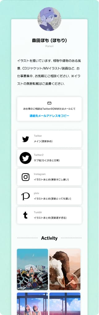 POTOFU's page customization is incredibly simple. No coding knowledge or complex settings required. Just choose between normal or dark theme, set your background with a color or uploaded image, and select a primary color for page accents. Combined with links list and posts, your creative possibilities are endless.